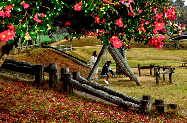 冬に親子連れで訪れターザンロープやブランコで時を過ごす楽しい場所は、山茶花が咲き誇る公園です。