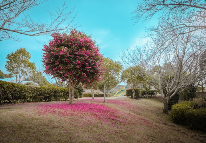 【講評】公園の何気ない風景ですが、澄んだ青空とサザンカの鮮やかなピンク色の対比が印象的です。